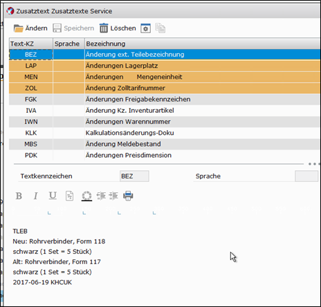 Wird bei Verwaltung des Teiles ein Feld geändert, für das in der Tabelle ein Textkennzeichen angegeben ist, wird unter diesem Textkennzeichen ein Text angelegt mit diesen Informationen: