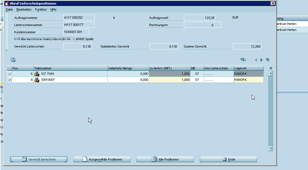 Dieser berechnet das Gewicht selektierter Positionen und addiert dieses zu Gewicht des Lieferscheins (schon erfasster Positionen) zu einem Gesamtgewicht.