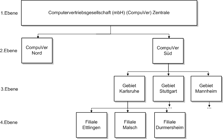 Angenommen meine Firma liefert Computerzubehör an verschiedene Filialen der Vertriebskette CompuVer. Die Vertriebskette gliedert sich nach folgendem Schema.
