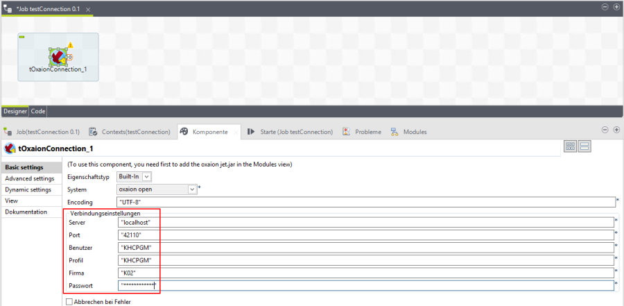 Beim anschließenden Klick auf diese Komponente und der Auswahl der Lasche Komponente könne die Oxaion Anmeldedaten eingegeben werden. Der Port ist hier der RMI Portserver. Das Profil muss angegeben werden, es darf nicht leer gelassen werden, wie eventuell bei der oxaion Anmeldemaske. Groß- und Kleinschreibung bitte beachten.