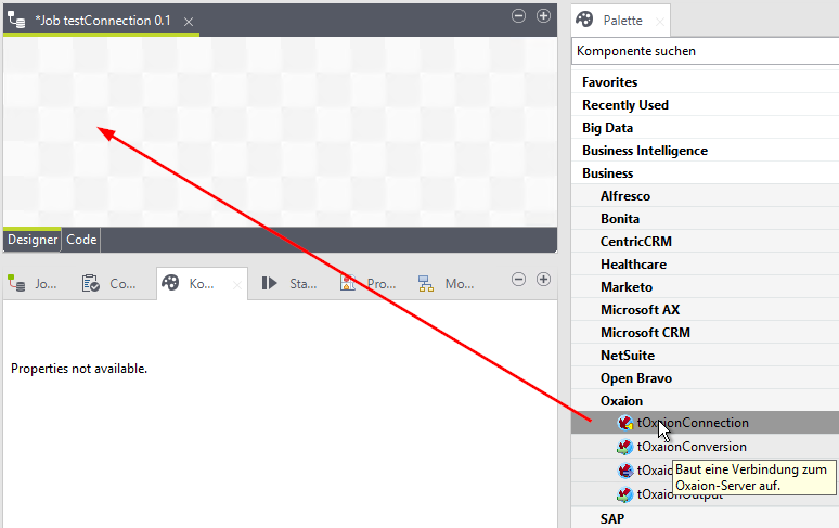 Anschließend öffnet sich im Designer ein leerer Job. Auf diese Fläche muss einer Komponente tOxaionConnection gelegt werden (s. Abbildung).