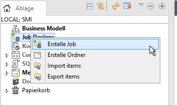 Um die Konfiguration und Installation des Tools zu überprüfen, ist nachfolgend ein kleiner Verbindungstest beschrieben. Zunächst soll ein neuer Job/Prozess angelegt werden. Über die rechte Maustaste auf Job Designs kommt man zu folgendem Kontextmenü.