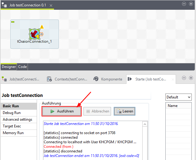 Um die Verbindung zu oxaion und die Funktion der Komponenten zu testen, muss der Job über den Button „Ausführen" gestartet werden.