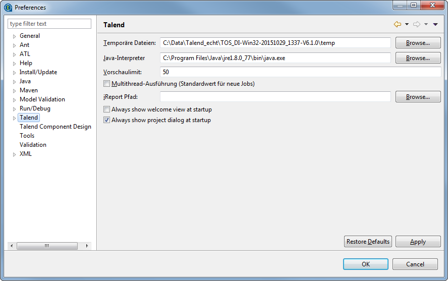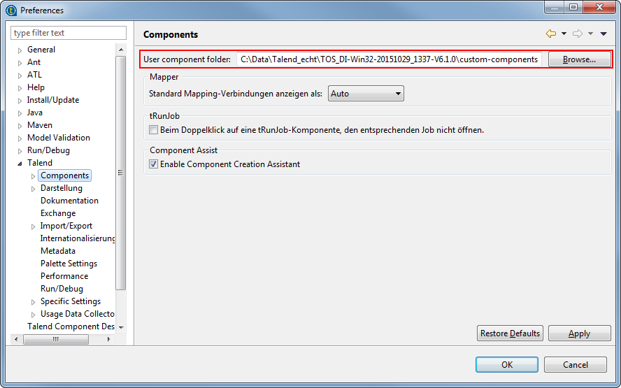 Zunächst muss im Installationsverzeichnis von Talend Open Studio for Data Integration ein Ordner namens customer-components erstellt werden. Dieser Pfad ist anschließend unter der Preferences des Tools zu hinterlegen: