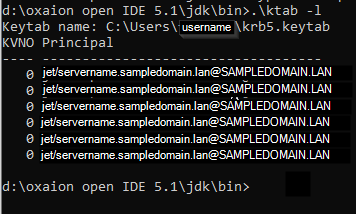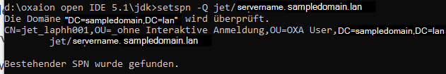 Beispiel für das Prüfen des vorhandensein eines Service Prinzipaljet/servername.sampledomain.lanmit dem Window Kommando setspn:In diesem Fall gibt es das Active Directory Benutzer-Konto "jet_servername" dem das Service Prinzipal "jet/servername.sampledomain.lan"zugeordnet wurde. Es darf nur ein einziges Active Directory Benutzer-Konto geben, dem ein bestimmtes Service Prinzipal zugeordnet wurde. Die Zuordnung wird üblicherweise mit durch den ktpass Aufruf erstellt. - Der Wechsel in das bin Verzeichnis der verwendeten Java Installationsverzeichnis