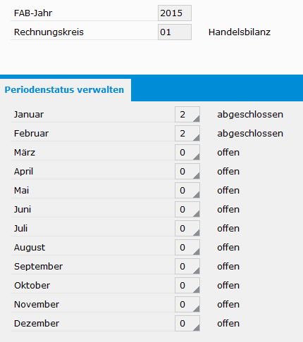 Programm 'FAB-Perioden verwalten': Die Perioden ‚Januar' und ‚Februar' haben den Status ‚2' abgeschlossen.