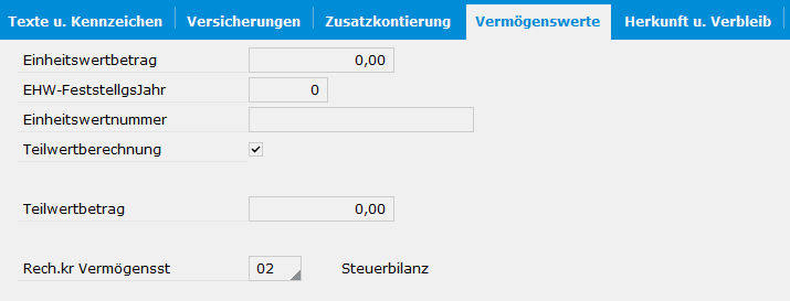 Im Anlagenstamm können in den Feldern 'Basiswert Versicherungen' Neuwerte für gebrauchte Wirtschaftsgüter oder Leasinggüter angegeben werden.