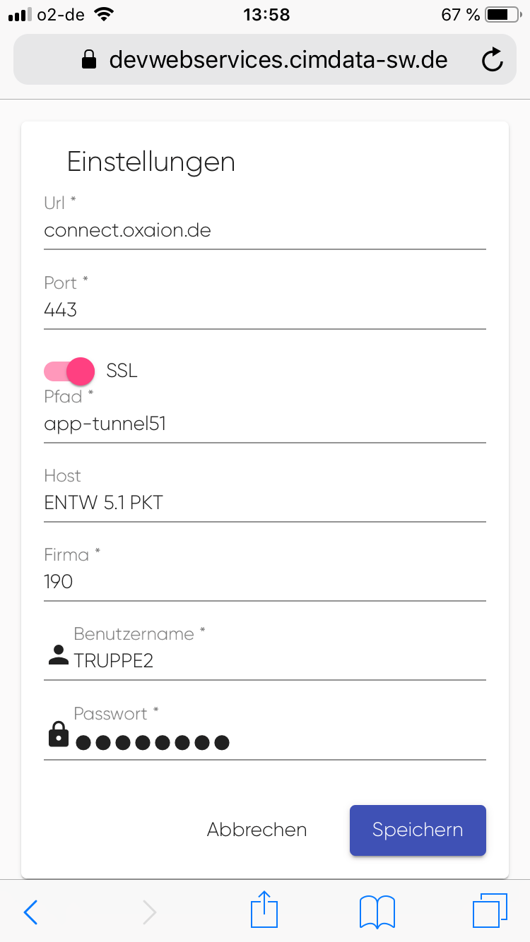 Über die Schaltfläche "EINSTELLUNGEN" gelangt man zu den Zugangseinstellungen, ohne die sich die App nicht verwenden lässt. Diese werden von der IT, welche die betreffende Schweizer oder Liechtensteiner Landesversion auf Kundenseite betreibt, bereitgestellt: