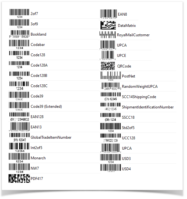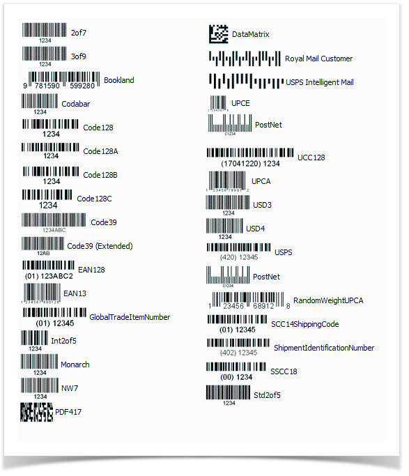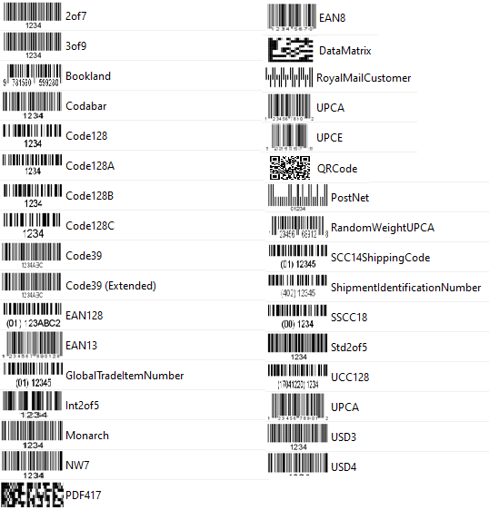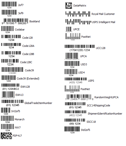 Unterstützte Barcodetypen mit iReport 4.1.2 als verdichtete Darstellung: |