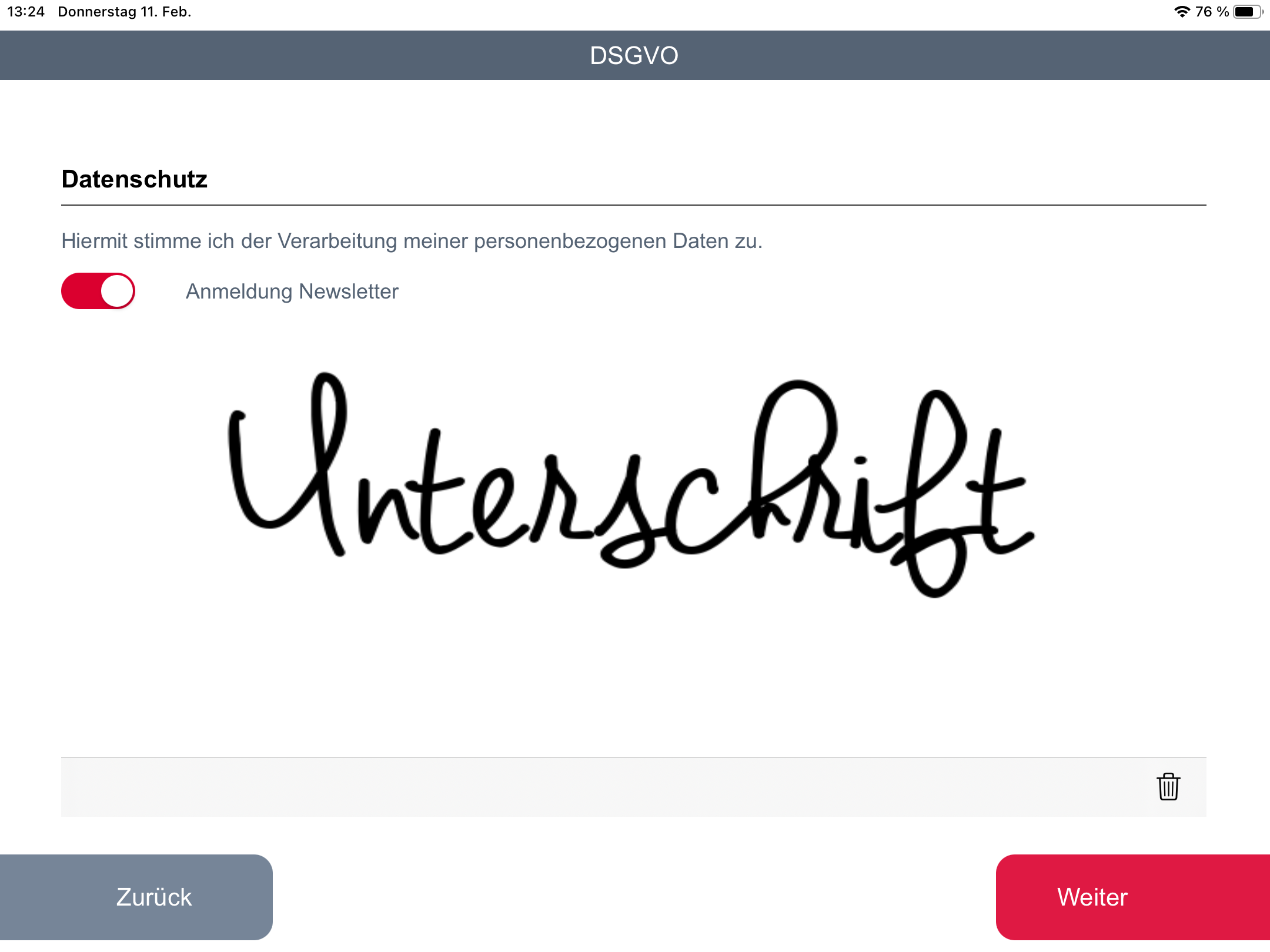 Die Unterschrift im Feld kann auf touchfähigen Geräten beliebig oft neu erstellt werden werden, bevor mit dem Speichern die Erfassung abgeschlossen wird.