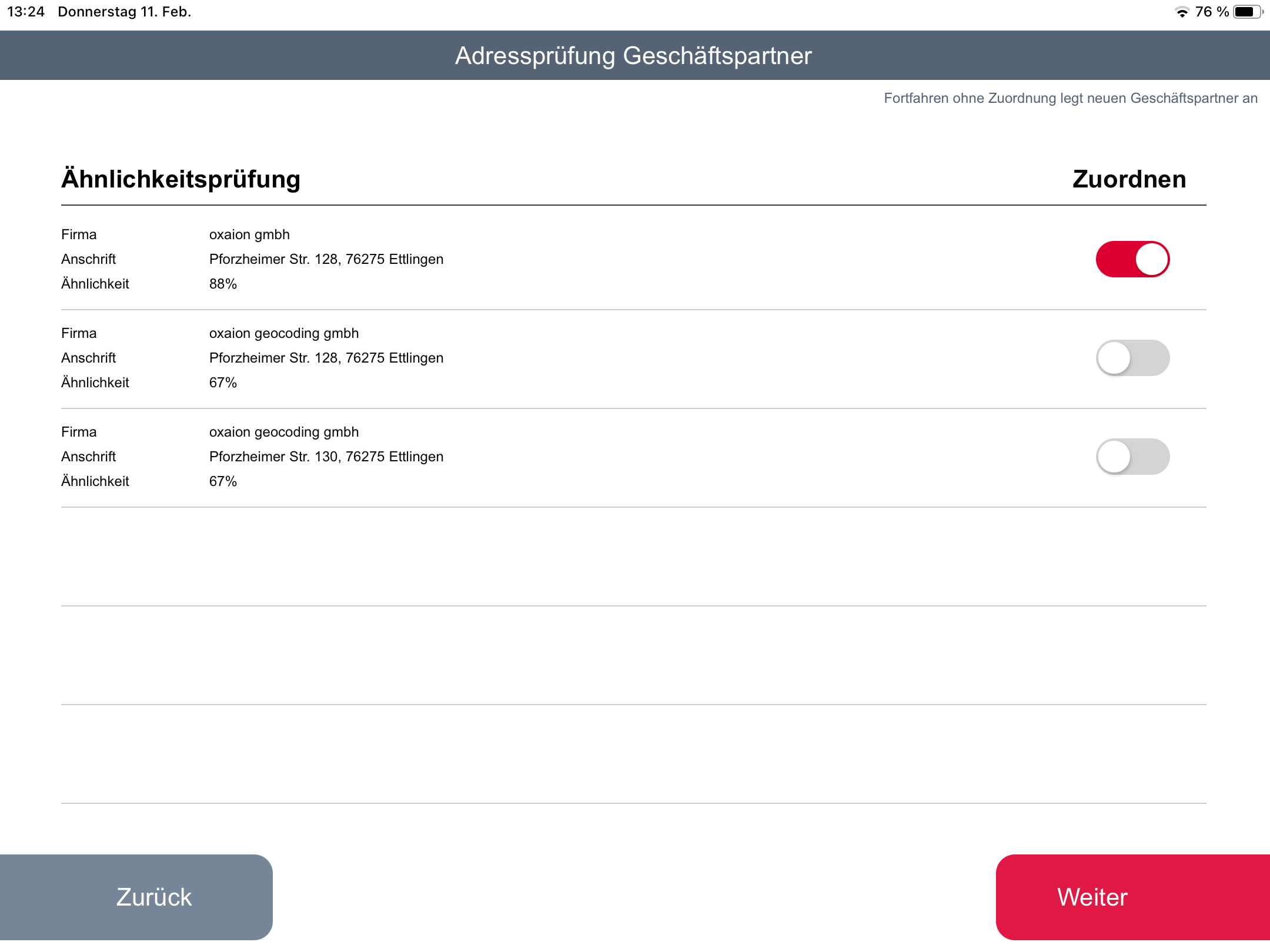 | Weiter | Die extrahierten und manuell ergänzten Daten werden für die Kopplung mit oxaion verwendet und es erfolgt die Adressprüfung Geschäftspartner und Zuordnung. |