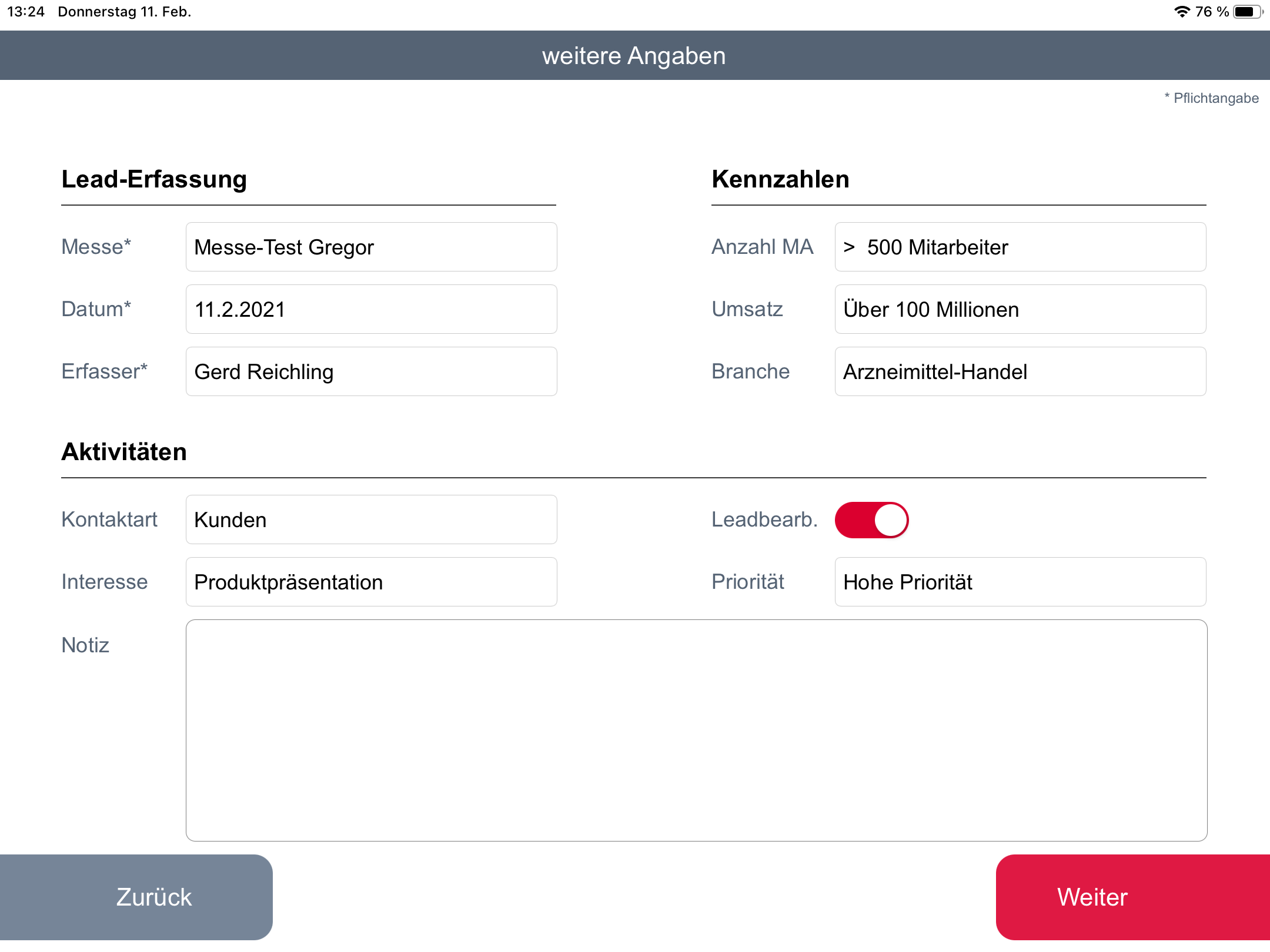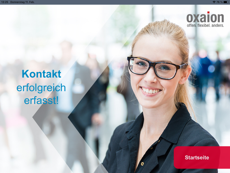 | Weiter | Die Eingaben werden bestätigt und es erfolgt die Prüfung der Daten auf Vollständigkeit. Erst nach fehlerfreier Prüfung der Daten und gelangt man zum Schritt oxaion Messe Leaderfassung-APP#Weitere Angaben erfassen. |
