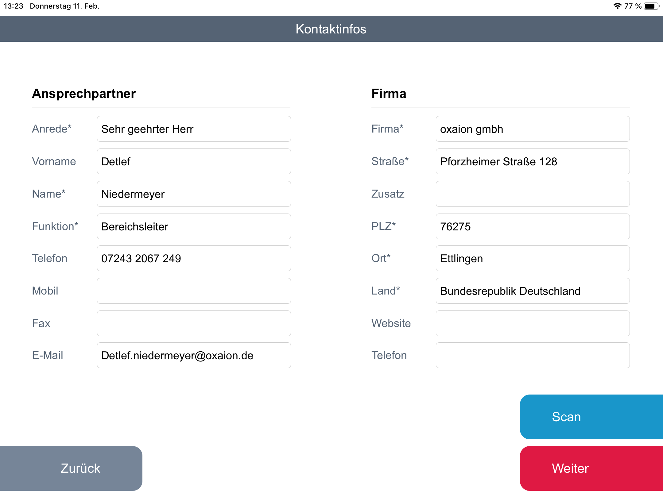 Die erkannten Daten des OCR Service werden in die Felder nur manuellen Nachbearbeitung übernommen. Damit sind die gleichen Möglichkeiten verfügbar wie bei der oxaion Messe Leaderfassung-APP#manuellen Erfassung und es können eventuell falsch erkannte Daten korrigiert und fehlende ergänzt werden.