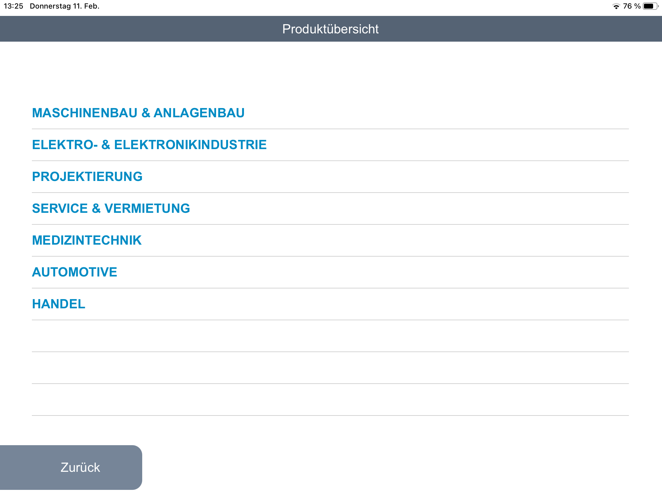 Vom Startmenü können Produktbroschüren angezeigt werden, mittels derer der Anwender in die jeweilige Produktgruppen-Detailansicht gelangt.