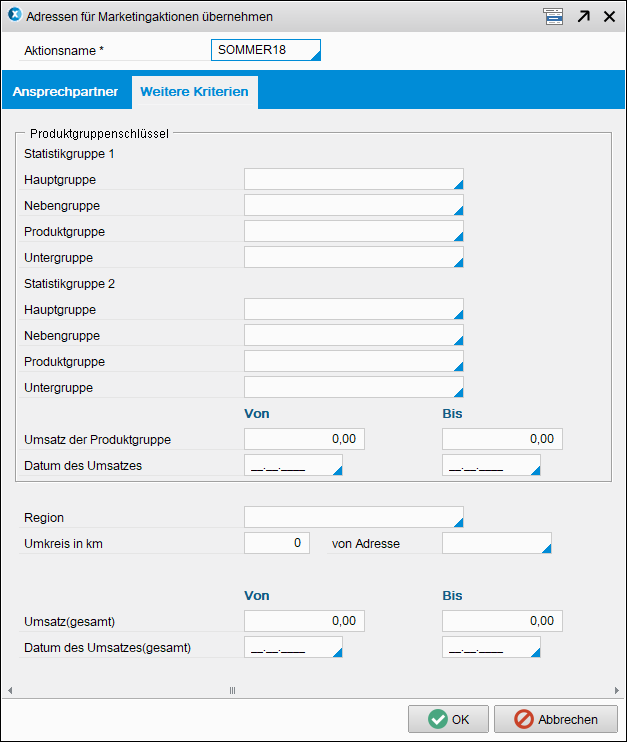 - Über Umsatzangaben kann man Kunden ansprechen, die in einem bestimmten Produktgebiet einen bestimmten Mindestumsatz gemacht haben, bzw. generell Umsatz erzeugt haben