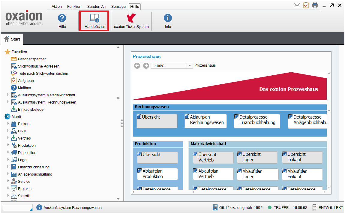 Im Karteireiter "Hilfe" am oberen Rand des Hauptfensters finden Sie das "Handbücher"-Piktogramm (vgl. Bild oben). Ein Mausklick auf dieses Piktogramm öffnet die Hauptseite der oxaion open 5.1 Dokumentation.