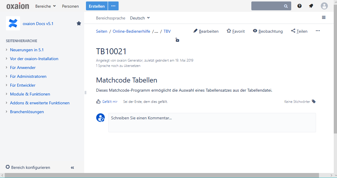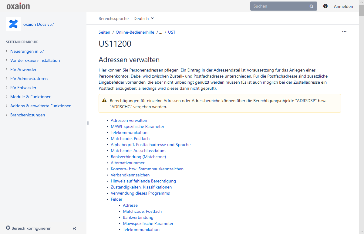 Die Dokumentation unter https://docs.oxaion.de/ steht kostenlos der Allgemeinheit zur Verfügung. Jedoch vergibt oxaion keine Benutzerzugänge für externe Anwender. Ohne Benutzerzugang kann man Dokumentation durchsuchen, online lesen und auch als PDF oder Word-Datei exportieren. Ohne Benutzeranmeldung sind dagegen weder Kommentare noch Seitenänderungen möglich. Die redaktionelle Pflege der oxaion Dokumentation verbleibt ausschließlich bei oxaion.