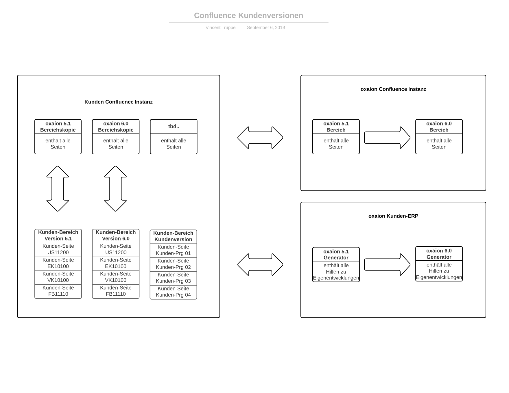 Für jedes Major Release (5.1, 6.0, tbd.) kopiert oxaion einen neuen Dokumentationsbereich in die Confluence Kunden-Instanz, der die gesamte Dokumentation zum betreffenden Release enthält. Diese Confluence-Bereichskopien sind Original-Vorlagen, die nicht zum Ändern gedacht sind, sondern als Kopier- und Wiederherstellungsgrundlage. Möchte ein oxaion-Kunde eine eigene Seitenversion einer oxaion Confluence-Seite erstellen, kann er über eine Sonderfunktion im oxaion Client die Generierung einer Kundenvariante einer bestehenden oxaion Confluence-Seite veranlassen. Hierbei legt der oxaion Client von derjenigen Confluence-Seite eine Kundenkopie an, die sich auf das oxaion-Programm bezieht aus dem heraus der Aufruf stattfand.
