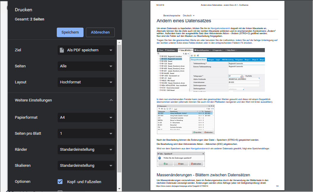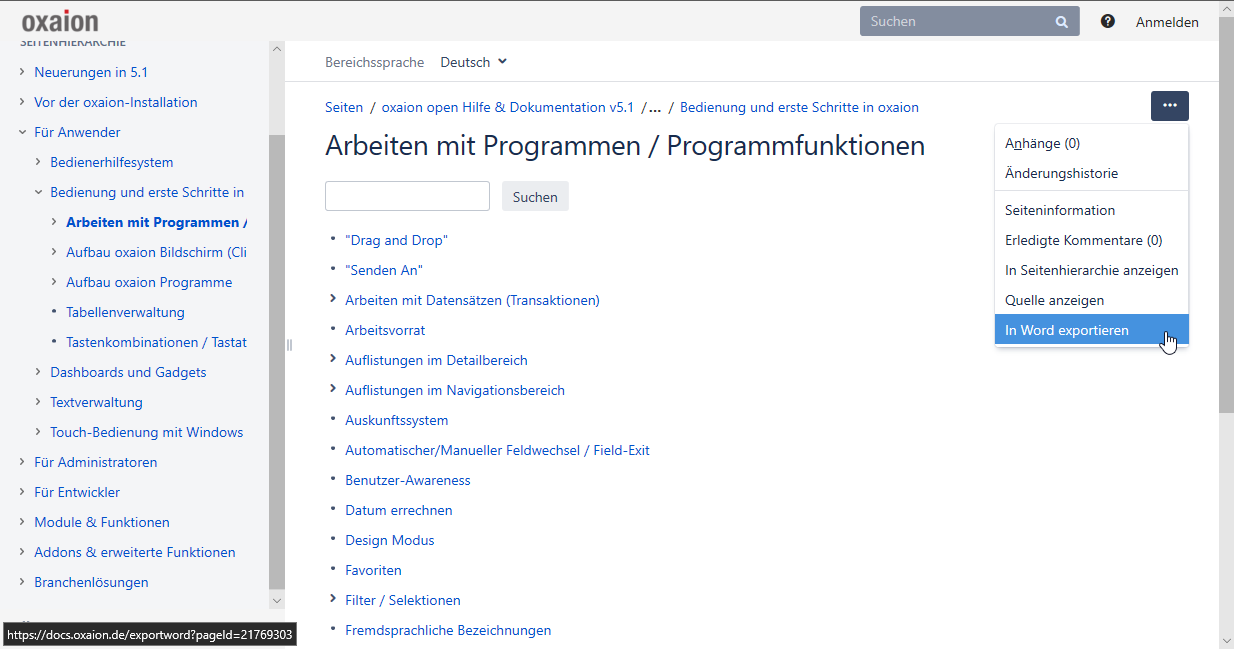 Einzelne Confluence-Dokumentationsseiten unter https://docs.oxaion.de/ können auf zwei Wegen exportiert werden: Als Word-Datei oder als PDF.