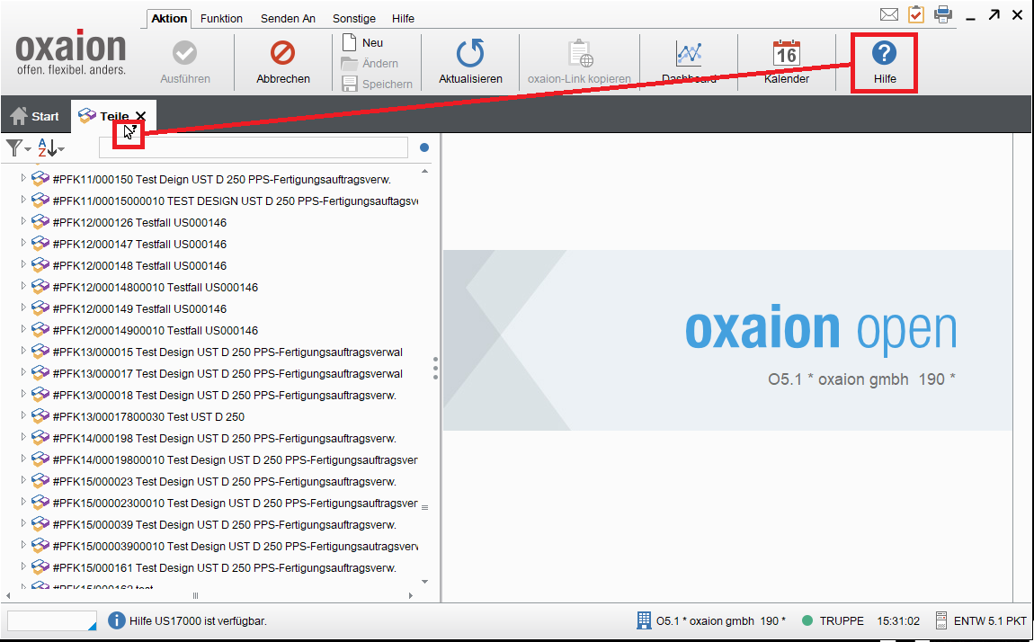 Die Programmhilfe kann direkt aus der oxaion Programmoberfläche aufgerufen werden. Es stehen folgende Wege zur Verfügung: