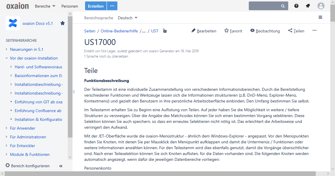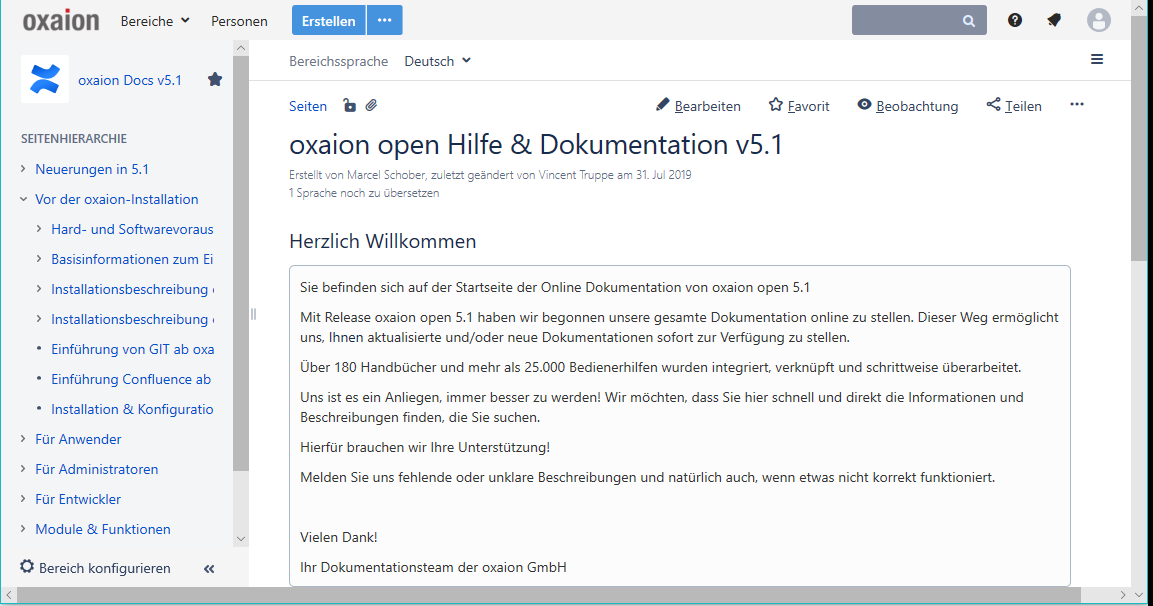 Für die Erstellung und Änderung eigener Confluence-Seiten bietet oxaion gesonderte Hilfe an. Bitte wenden Sie sich hierzu an ihren oxaion Kundenbetreuer oder an info@oxaion.de.