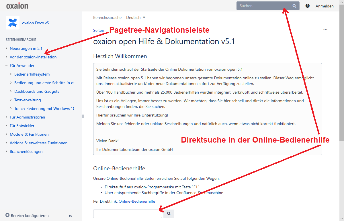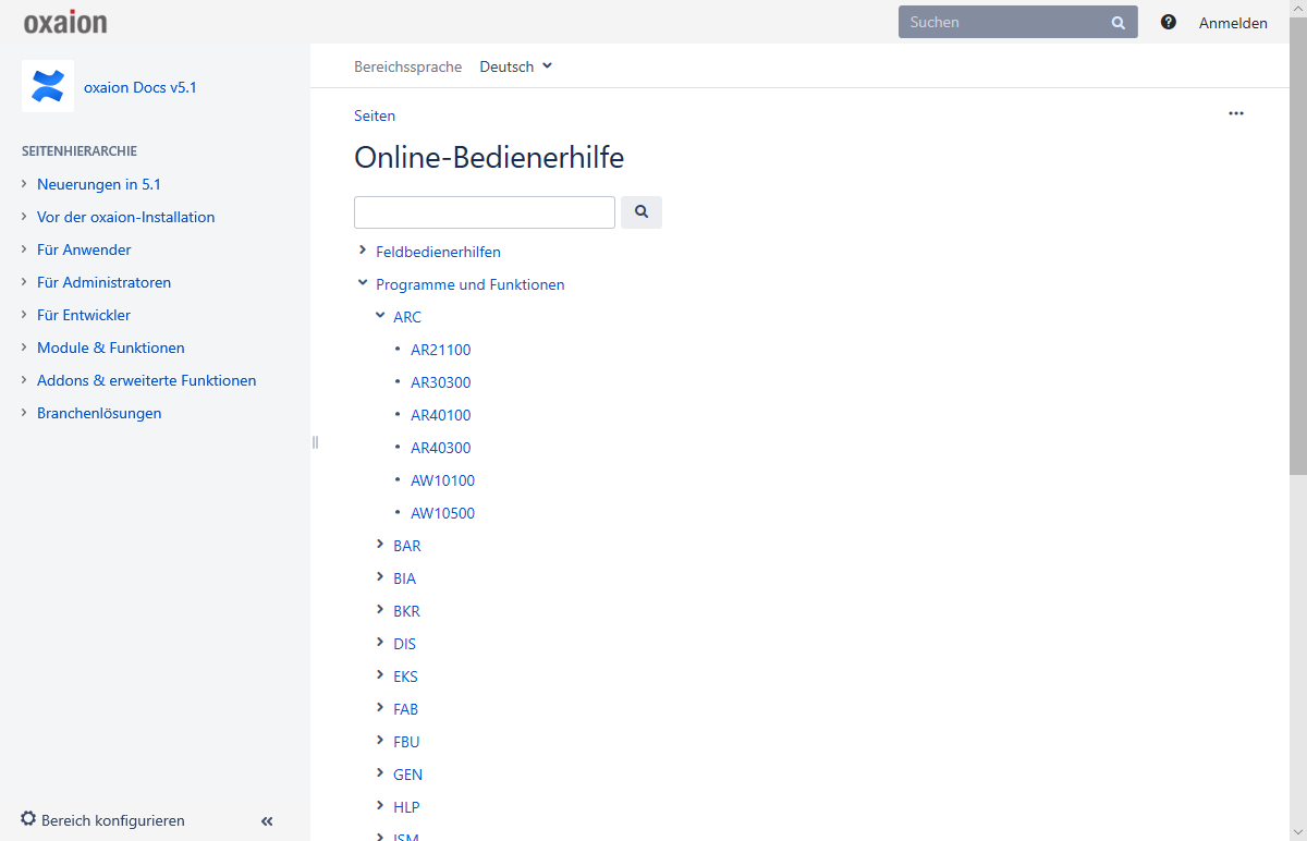 Die oxaion Bedienerhilfe ist über die URL https://docs.oxaion.de/ öffentlich zugänglich. Sie basiert auf dem Online-Dokumentationssystem Confluence.
