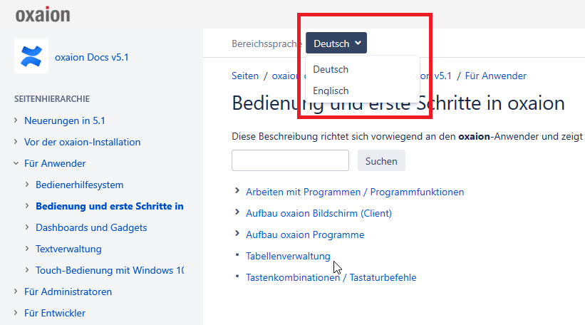 Die oxaion Bedienerhilfe ist zweisprachig. Sie wird in deutscher und in englischer Sprache angeboten. Die englische Version betrifft aktuell nur den Bereich oxaion open 5.1. Hier gibt es Übersetzungen für folgende Themenstrukturen: