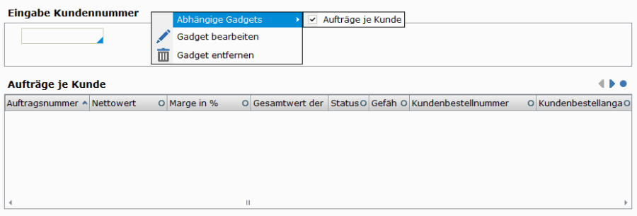 Manche Gadgets erlauben es Abhängigkeiten zu anderen Gadgets herzustellen. So ist es z. B. möglich eine Auflistung "Aufträge je Kunde" (VK30100) von einem Gadget "Eingabe Kundennummer" abhängig zu machen. Wird im Eingabefeld eine Kundennummer eingegeben und ENTER gedrückt, wird diese Kundennummer an die Auflistung weitergegeben und die Aufträge für den eingegebenen Kunden angezeigt.