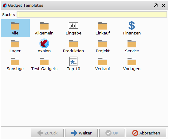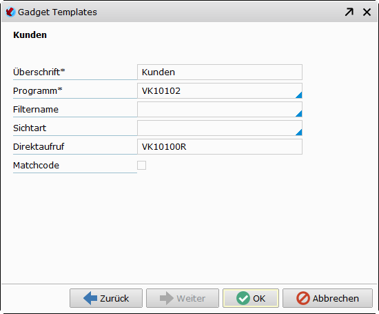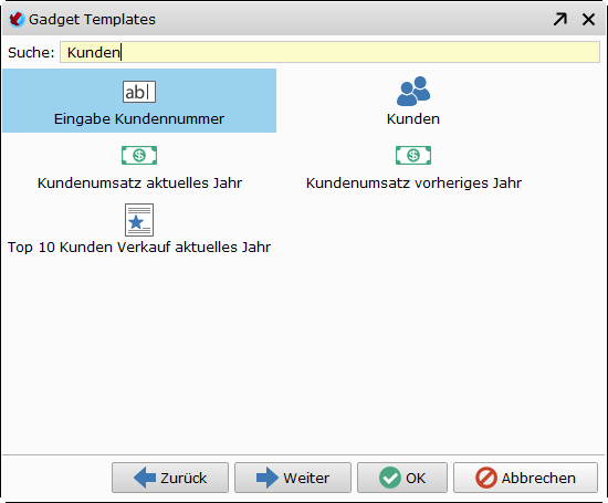Wenn bereits alle Pflichtfelder ausgefüllt sind, kann das Gadget direkt per Doppelklick auf die Vorlage oder Klick auf den OK-Button hinzugefügt werden. Durch Klick auf den Weiter-Button werden weitere Parameter des gewählten Gadgets geändert. Sind nicht alle Pflichtfelder ausgefüllt, führt auch der Doppelklick auf die Vorlage zur Parameter-Seite.