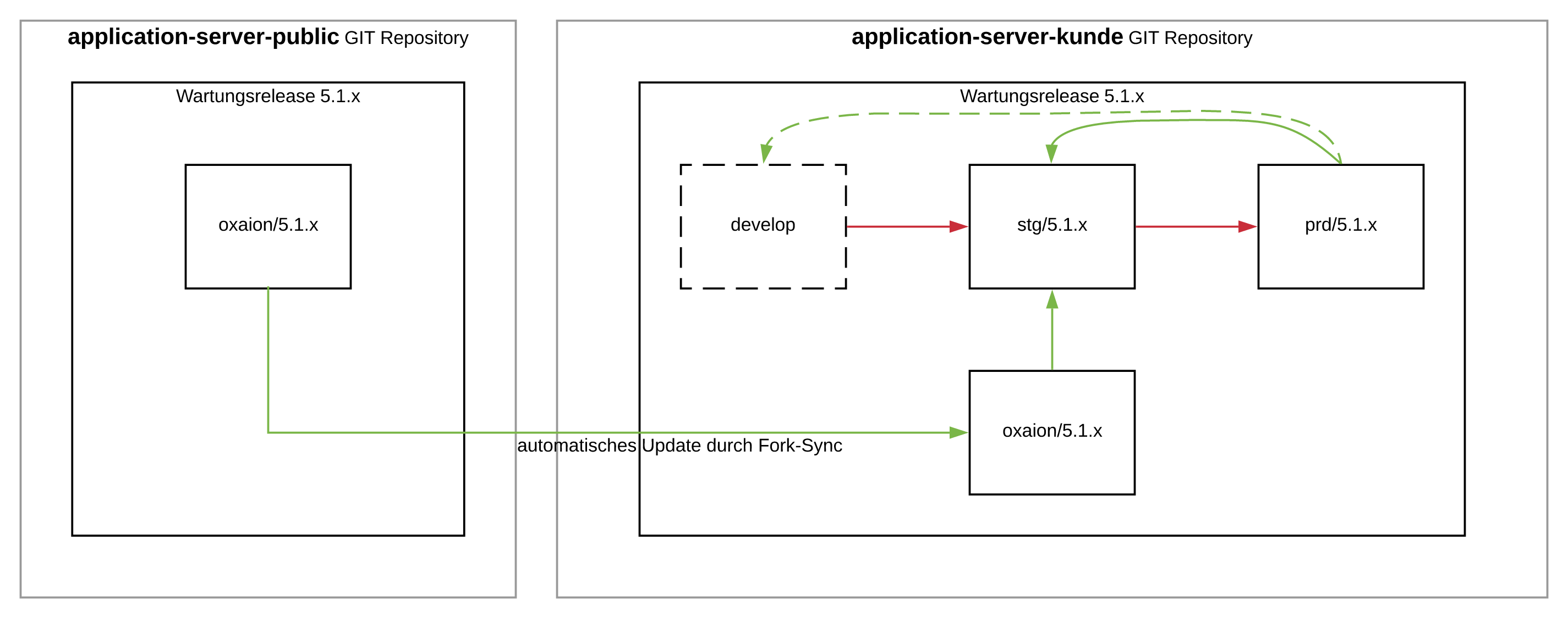 Hierbei ist ersichtlich dass, ein im für alle Kunden öffentlichen open GIT-Repository (application-server-public), markierter (getagged-ter) Stand automatisiert in den jeweiligen Release-Zweig (Branch) synchronisert wird. Im Beispiel ist hier der oxaion/5.1.x Zweig dargestellt.