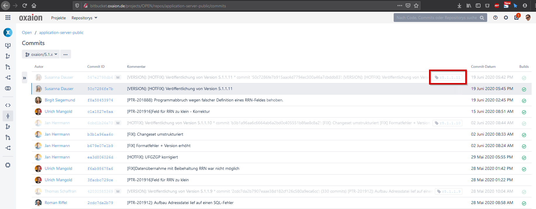 In Bitbucket kann der aktuelle Patchstand über eine Suche nach dem aktuellsten oxaion-Versions-Tag ermittelt werden.