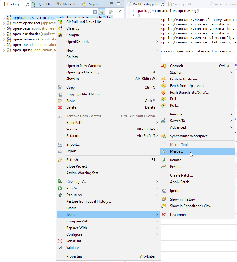 Des weiteren ist zu sehen dass die aktualisierten Quellen von diesem Zweig (z.B. oxaion/5.1.x) aus in den jeweiligen stg-Zweig (stg/5.1.x = Staging Zweig des Releases 5.1) gemischt (gemerged) werden.