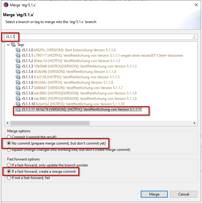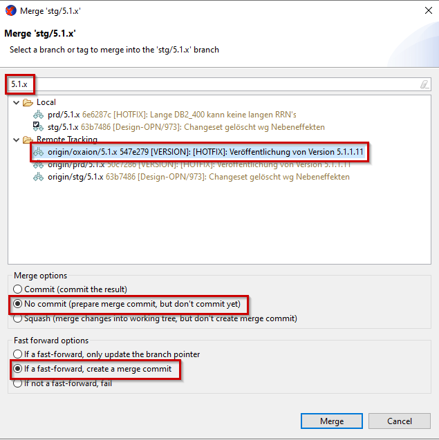 Die Optionen "No commit (...)" sowie "If a fast-forward, create a merge commit" sind im Beispiel ausgewählt um den Merge-Commit nochmals prüfen und ggf. auch einen eigenen Committext vergeben zu können.