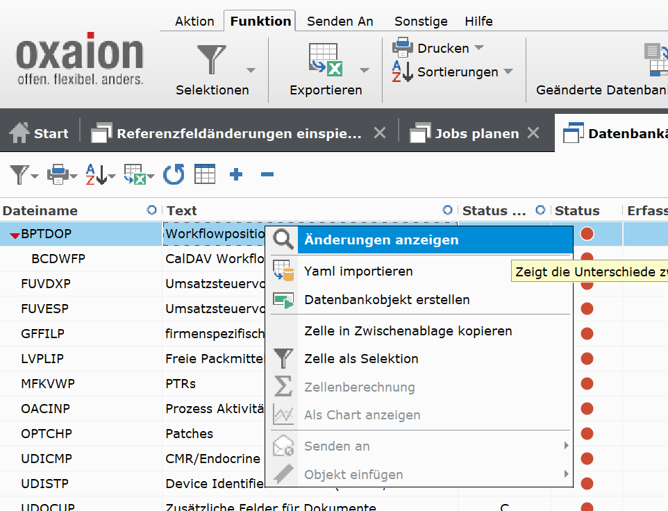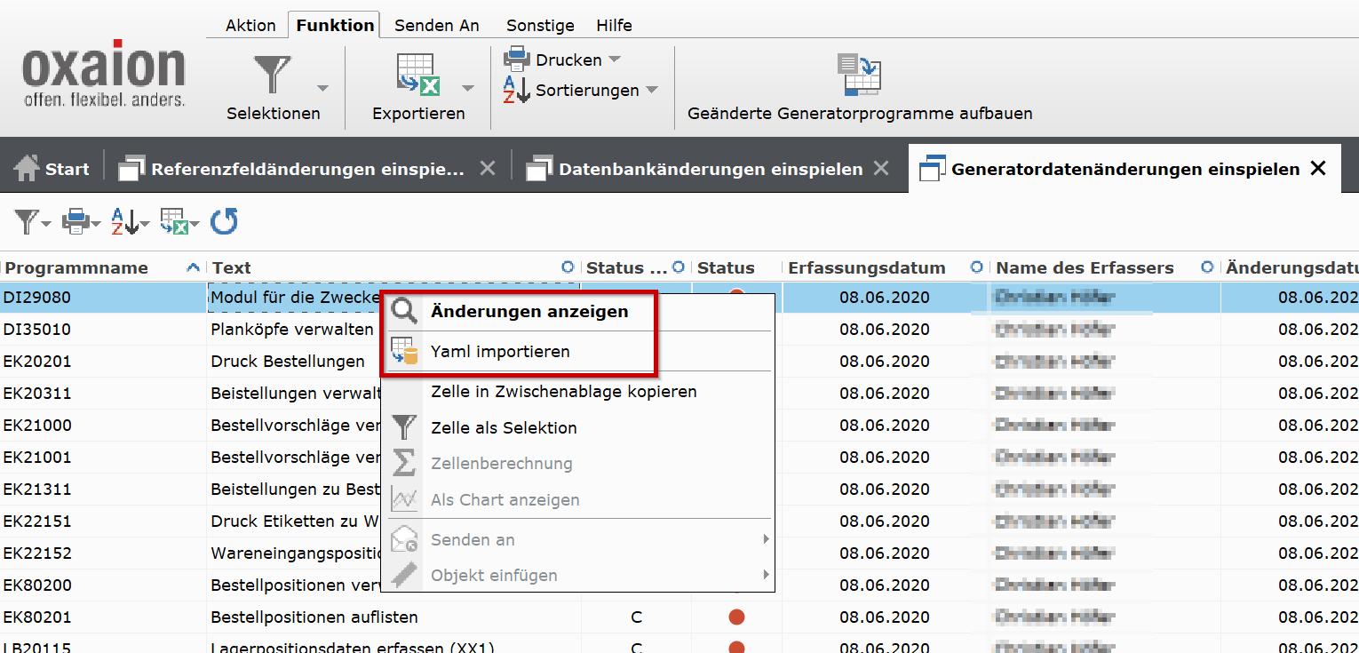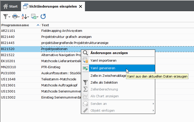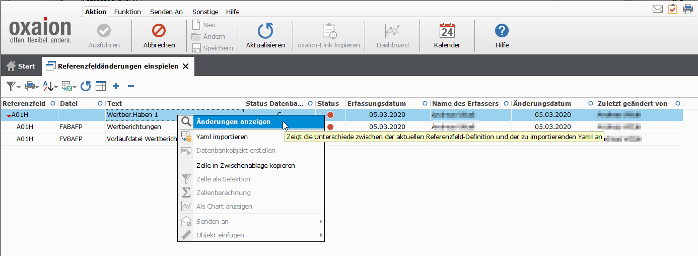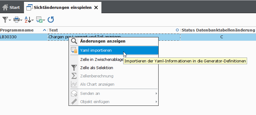 Per Rechtsklick auf einen Listeneintrag können die Änderungen an den Sichtdaten des Programmes angezeigt oder in die aktuelle Nutzerumgebung importiert werden: