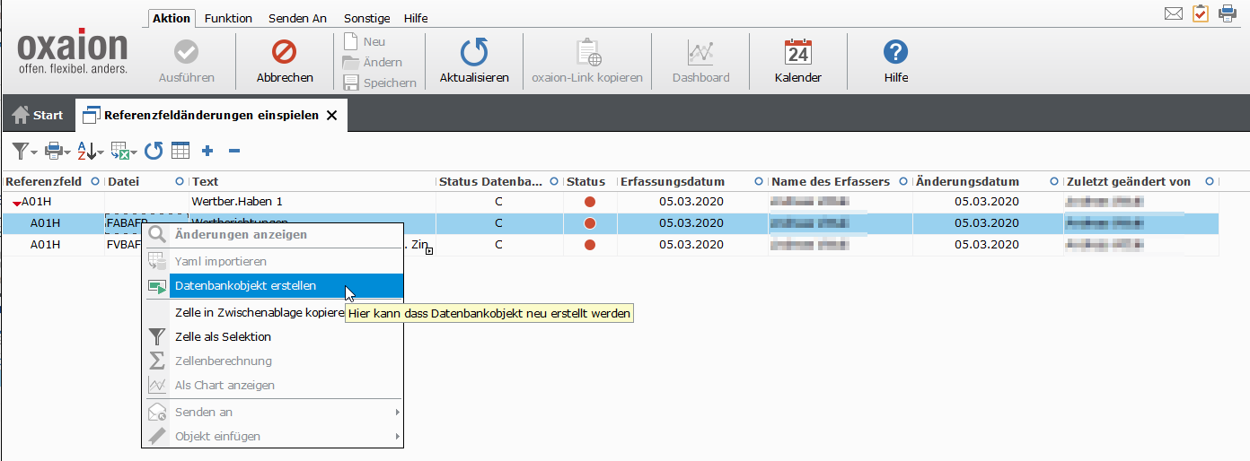 Per Rechtsklick auf einen Eintrag der zweiten Ebene (=betroffene Tabellen) kann die entsprechende Tabelle aktualisiert werden (= Create Objects CO).