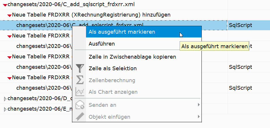 Per Rechtsklick kann ein Changeset als ausgeführt markiert werden oder noch einmal ausgeführt werden: