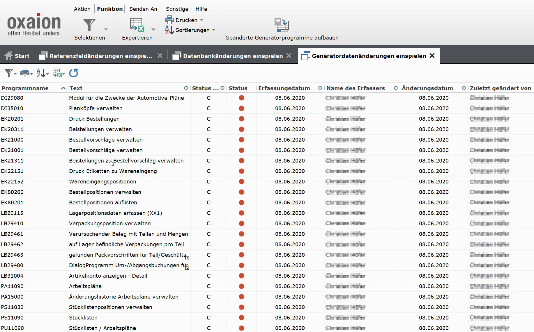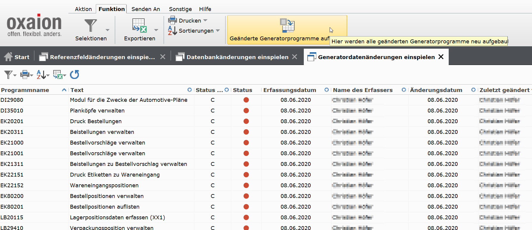 Die Änderungen an den Programm-Metadaten werden mittels des Programmes OP70120 "Generatordatenänderungen einspielen" übernommen.