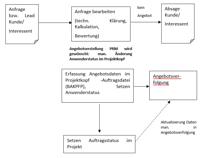 Da mit der Anfrage bereits einige Daten für ein späteres Angebot bekannt sind, kann über das Kontextmenü eine Anfrage als Rumpfangebot übernommen werden. Dies wird für das Modul Service für den Serviceauftrag unterstützt. Die Integration mit den Modulen Vertrieb sowie Projekte ermöglicht, dass auf Wunsch mit der Erstellung des Angebotes die notwendigen Daten der Angebotsverfolgung erzeugt werden. Eine Umwandlung von einem Angebot in den Auftrag aktualisiert die Daten der Angebotsverfolgung (z.B. Status, Wert, Auftragsnummer)