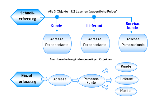 Ein Kunde kann entweder über eine Schnellerfassung (Basisstammdaten) oder durch Erfassung der einzelnen Objekte erfolgen. Bei der Schnellerfassung werden alle drei benötigten Stammdaten (Objekte) mit den wesentlichsten Daten angelegt. Die Nachbearbeitung durch die jeweiligen Fachabteilungen kann durch die automatische Anlage von einem Workflow unterstützt werden.