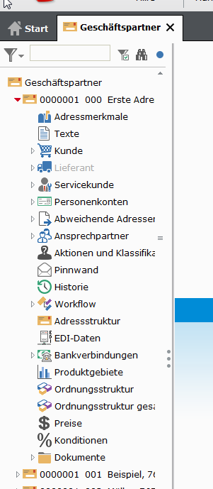 Der Einstieg in das Kundeninformationssystem erfolgt üblicherweise über den Geschäftspartner-Explorer. Hier wird eine Auflistung von Adressen mit der Möglichkeit der Verzweigung in weitere Strukturen ermöglicht.