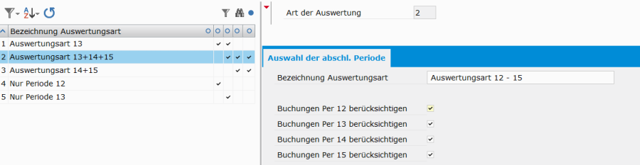 So kann z.B. eine Auswertungsart mit nur der Periode 12 und eine Auswertungsart mit der Periode 12 und 13 oder eine Auswertungsart mit allen Perioden 12 – 15 definiert werden.