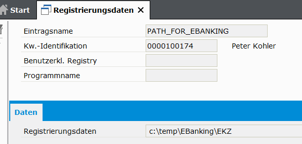 Pfad eBanking | Pfadangabe, entsprechend dem Dateisystem, für den Ort an dem die PC-Datenschnittstellen (eBanking- Dateien) abgelegt werden. Es muss ein absoluter Pfad in der Registry ANWG / FBU / PATH_FOR_EBANKING verwendet werden. Die von der Bank-Software generierten Dateien auszug.txt und umsatz.txt (oder swift.txt) werden in diesem definierten PC- Pfad abgelegt. |