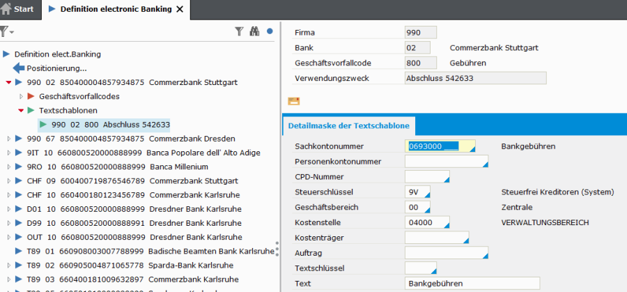 Die Textschablonen sind eine Erweiterung eines Geschäftsvorfallcodes und werden dazu verwendet, an Hand einer feststehenden Zeichenfolge aus den Verwendungszeilen einer Kontoauszugsposition, im Electronic-Banking eine abweichende Verarbeitung einzuleiten bzw. die Verbuchung der Auszugsposition auf ein Vorgegebenes Konto durchzuführen.