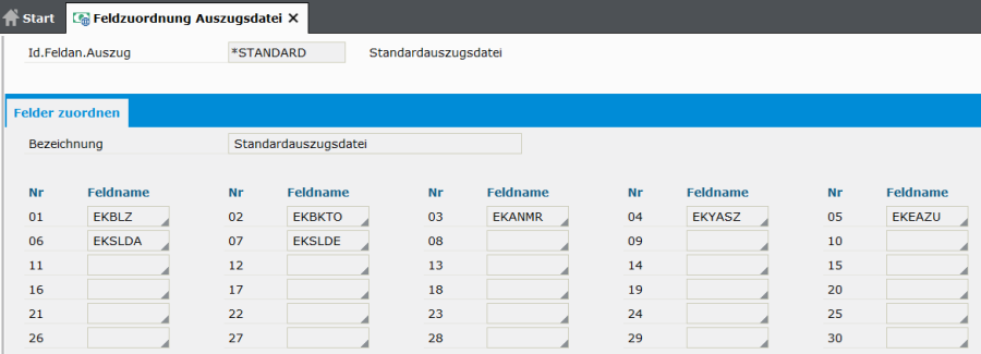 Mit dem Programm "Reihenfolge der Auszugsdatei verwalten" wird die Feldanordnung der Eingangsschnittstellendatei "Kopfdaten FEASZP" unter einer Kennung definiert.