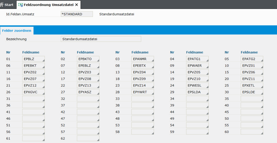 Mit dem Programm "Reihenfolge der Umsatzdatei verwalten" wird die Feldanordnung der Eingangsschnittstellendatei "Positionsdaten FEUSZP" unter einer Kennung definiert.
