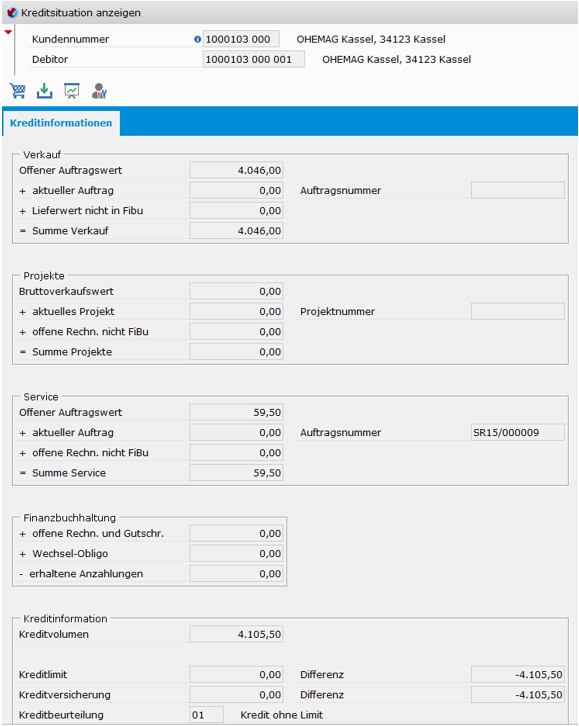 Ist im Kundenstamm keine Kreditbeurteilung hinterlegt, so wird für die Kreditprüfung das Minimum aus Kreditlimit und Kreditversicherungsbetrag herangezogen.