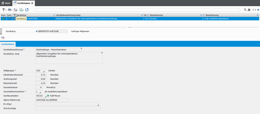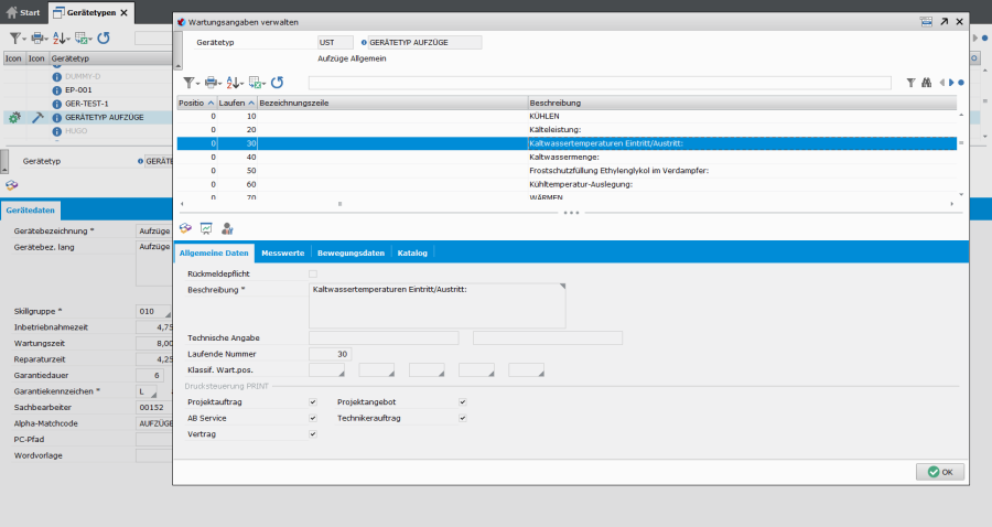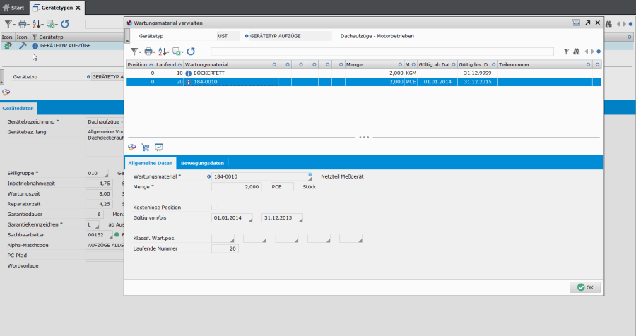 Aus der Verwaltung des Gerätetyps heraus werden Wartungs- und Technikangaben sowie vorgesehenes Wartungsmaterial gepflegt.