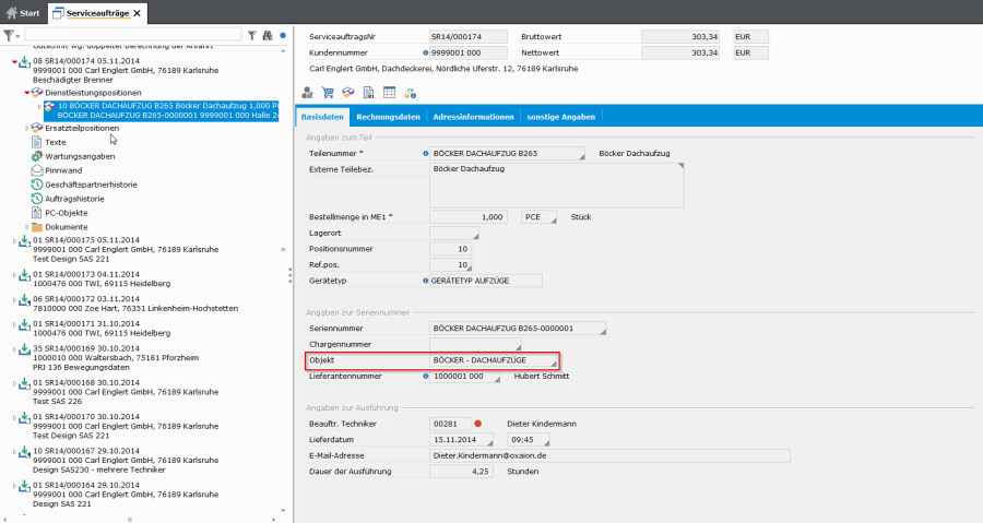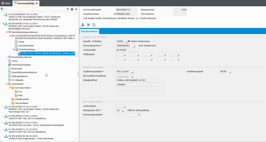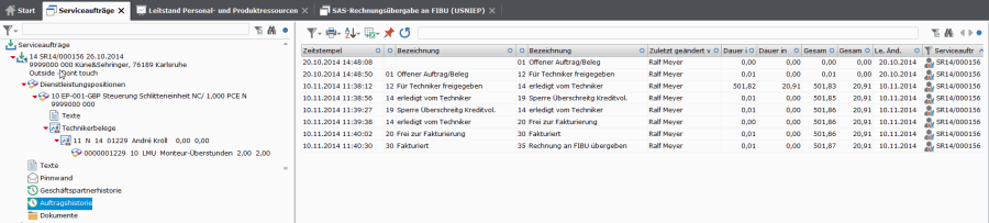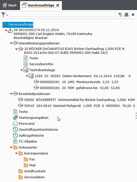 Serviceaufträge können aus Auftragskopf mit Zusatztexten, Dienstleistungs- und Ersatzteilpositionen, Wartungskomponenten, Wartungsangaben, Zusatztexten zur Dienstleistungsposition, Abrechnungsbelegen (in der Regel vom Kunden abgezeichnete Arbeitsberichte) und Serviceberichten mit z.B. Fehlerursachen, bestehen. Zur Terminabstimmung lassen sich auch anstehende Aufgaben als Workflow-Positionen anfügen.