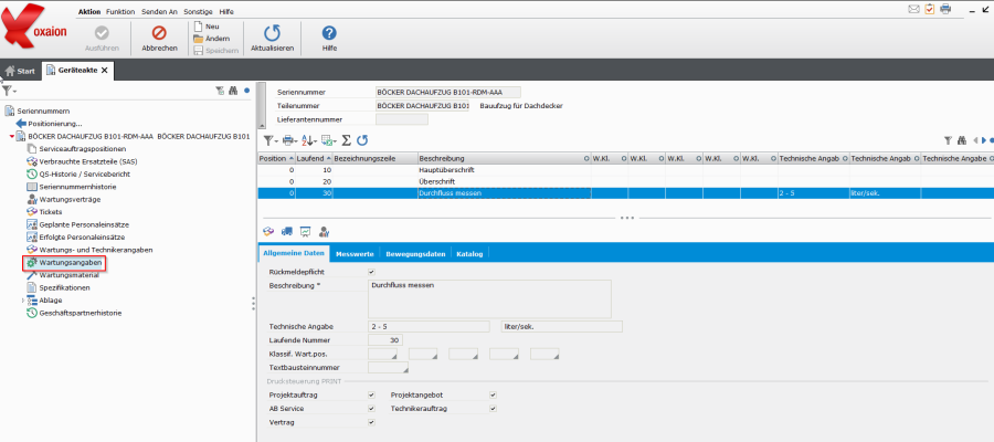 In oxaion können komplexe Anlagen mit dem Projektmodul auch für Serviceaufgaben beschrieben werden. Liegt kein Projektmodul vor, so ist diese Beschreibung des Wartungsumfangs sowohl beim Gerätetyp, in der Geräteakte als auch im Wartungsvertrag möglich.