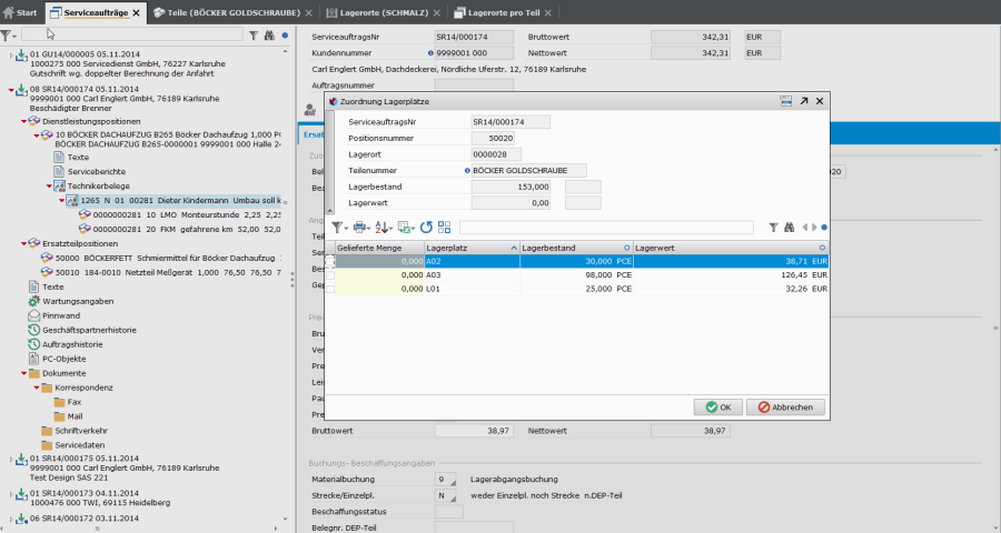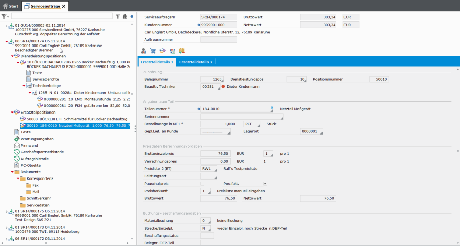 Im Serviceauftrag wird Wartungsmaterial wie Ersatzteile verwaltet.